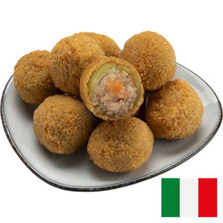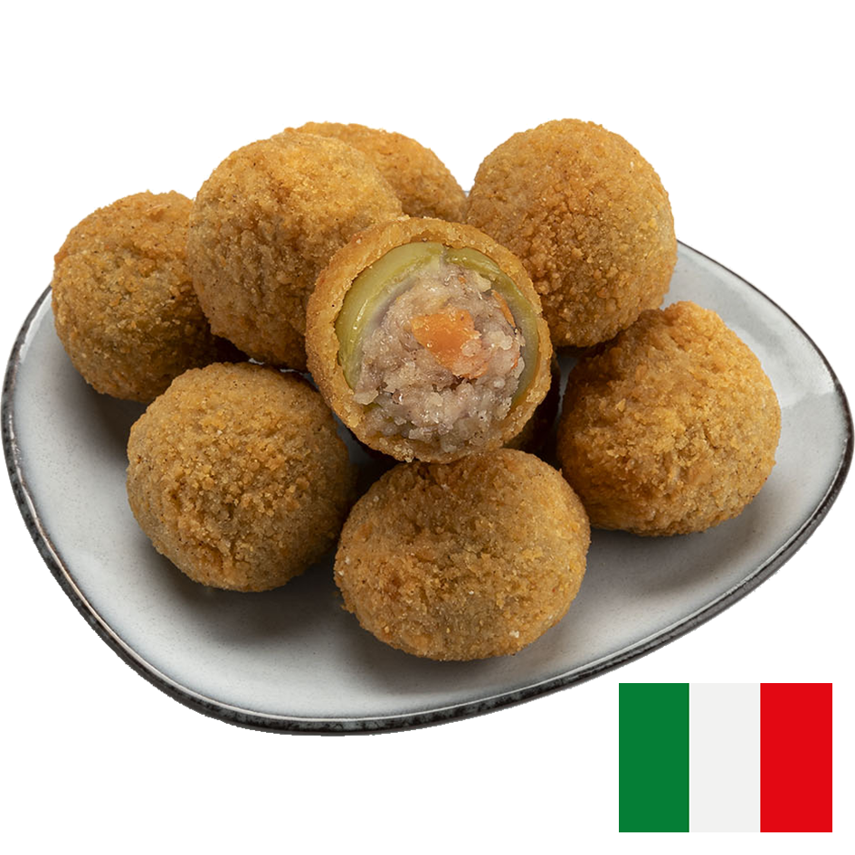 En traditionell specialitet från regionen Marche, som nu blivit en internationell hit! Stora gröna oliver som kärnats ur och fyllts med en läcker blandning av kött (nöt, kalkon och fläsk), riven ost och kryddor och sedan panerats. Utmärkta till en aperitif på mousserande vi, som snacks, till förrätt eller som tillbehör till en annan rätt.