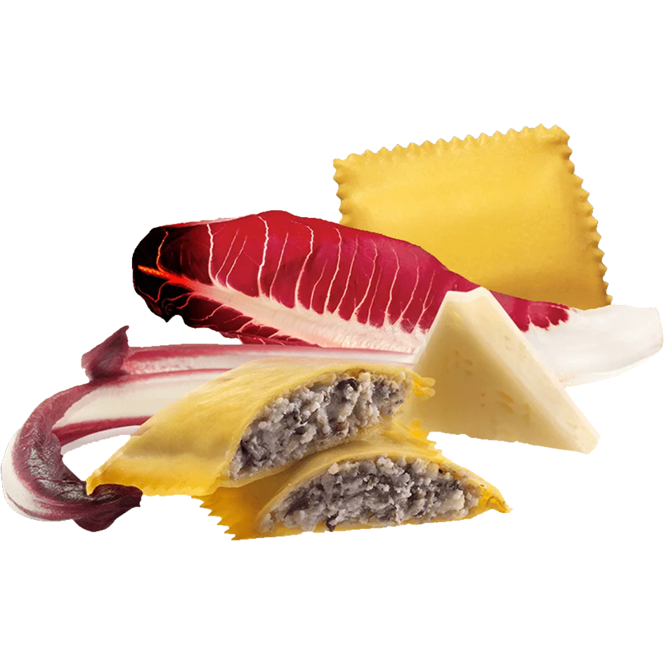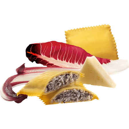 Högkvalitativ pastadeg på durumvete och färska ägg, fylld med ursprungsmärkt röd radicchiosallad från Treviso samt Asiago DOP, en mild men smakrik hårdost från bergen. Servera med endast lite olivolja och riven ost för att fyllningens smak skall komma till sin rätt. Även god att servera med t.ex. en reduktion på portvin, eller med pancetta och valnötter.