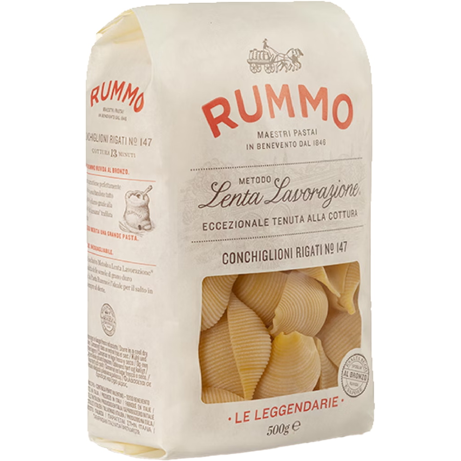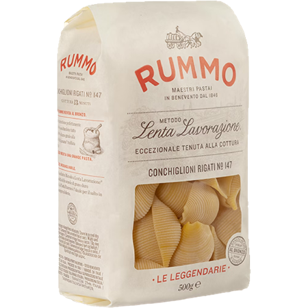 Rummo har tillverkat pasta av högsta kvalitet i Benveneto sedan 1846. Pastan tillverkas på utvalt durumvete och den långa knådnings- och torktiden ger en unik konsistens. Tillverkas med bronsvalsar, som ger en porös yta som tar upp såsen optimalt.